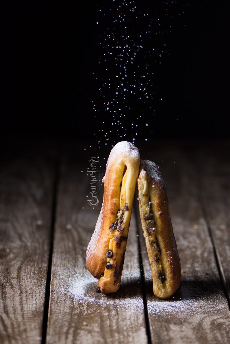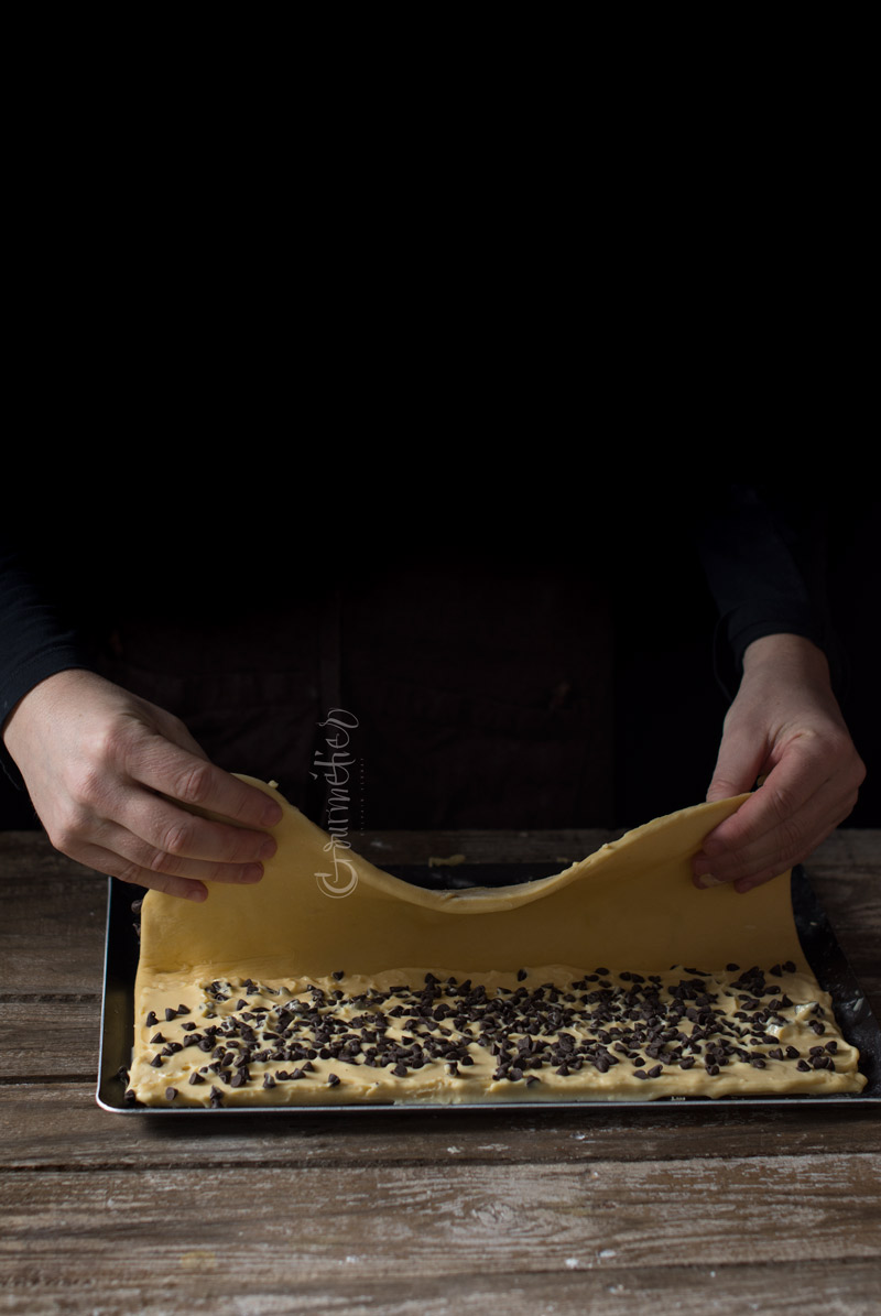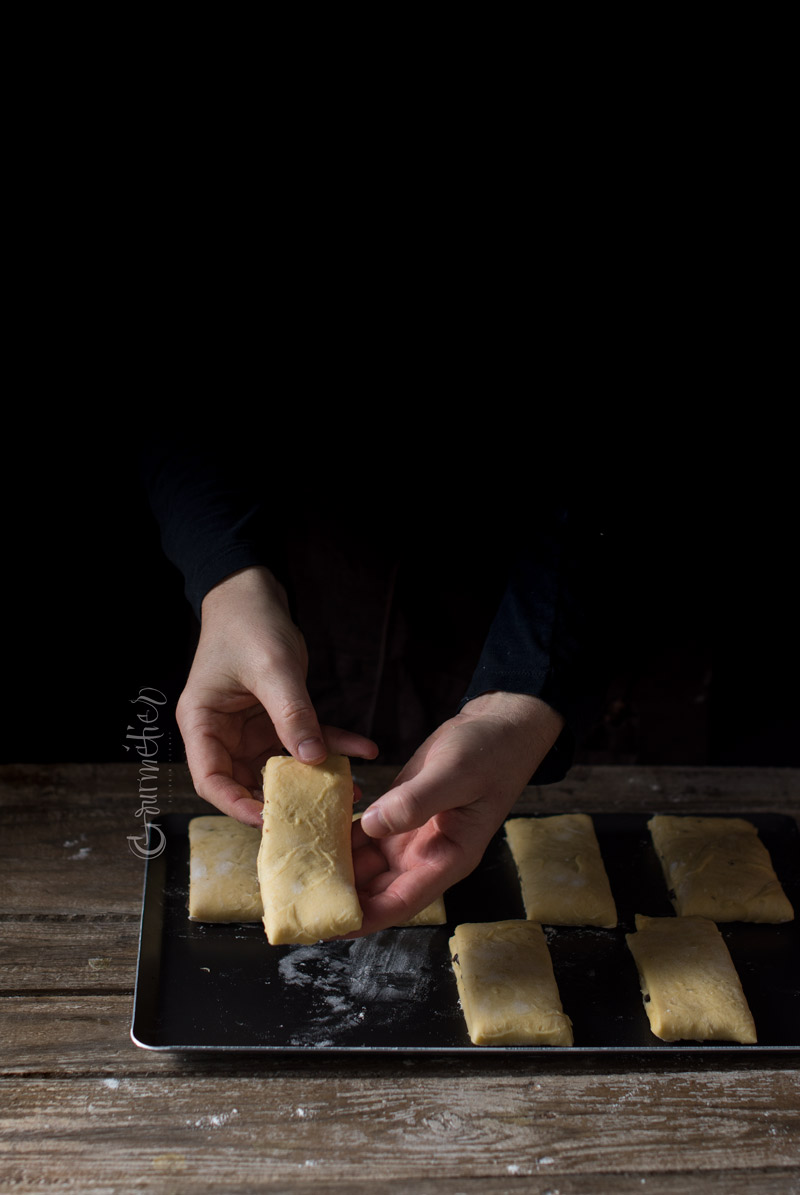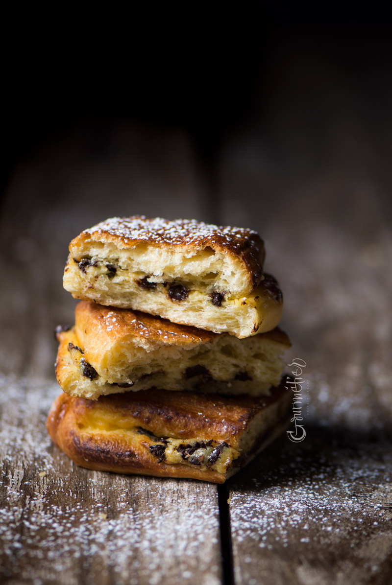 Este bollo es una variante de las napolitanas, pero en vez de hacerse con masa hojaldrada fermentada se realiza con una masa de brioche tradicional. El resultado es un bollo esponjosísimo y con el sabor estupendo del chocolate y de la crema (que, por cierto, podemos aromatizar con lo que queramos: naranja, licor, vainilla, etc.).