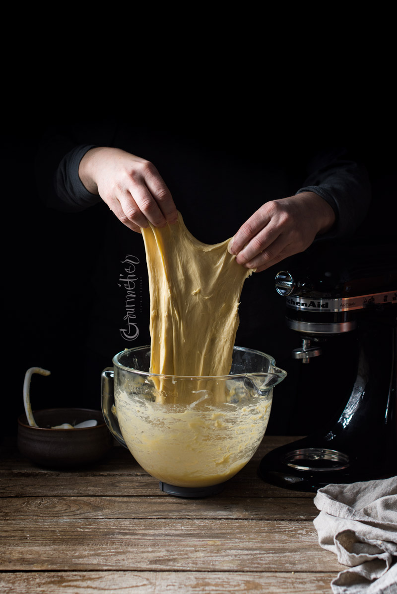 Una vez añadida toda la mantequilla, subimos la velocidad (4 en KA) y seguimos amasando. Todo este proceso puede durar de 10 a 15 minutos. Al final del amasado, la masa tiene que estar brillante y elástica, pero sin pegarse a las manos. La temperatura final de la masa no tendrá que sobrepasar los 28 ºC. Si fuera hace mucho calor, podéis trabajar con ingredientes fríos (excepto la mantequilla, que tiene que estar en punto pomada).
