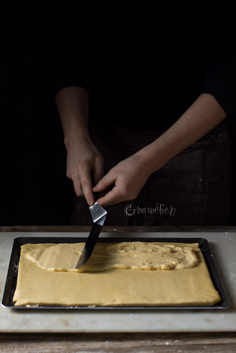 Volvemos a colocar nuestro rectángulo de masa encima de la superficie de trabajo y, con la ayuda de una espátula, cubrimos la mitad superior de la masa con crema (5 mm).