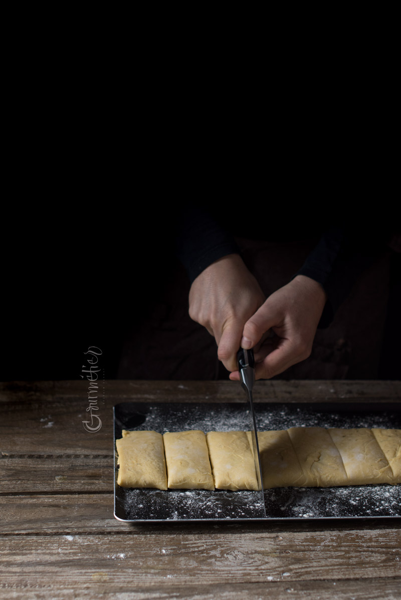 Transcurrido este tiempo, quitamos los rebordes y cortamos rectángulos de masa de unos 4 cm de largo con la ayuda de un cuchillo afilado o de un cortador de pizza.
