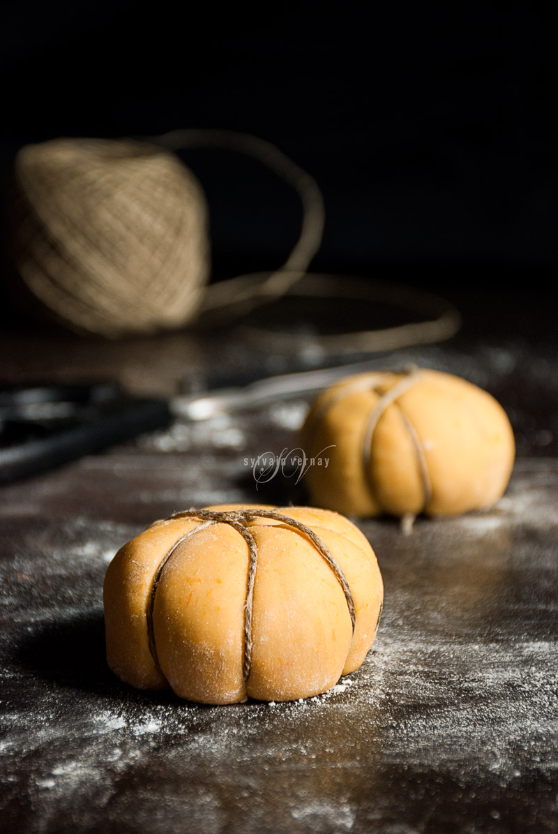 «Atar» cada bola de masa con hilo bramante, sin apretar demasiado, para que cuando la masa crezca se formen zurcos parecidos a los de la calabaza.
