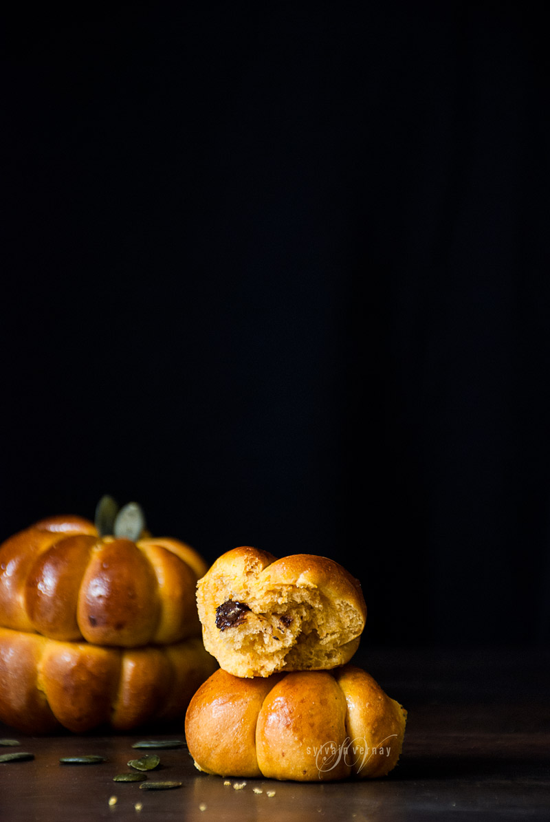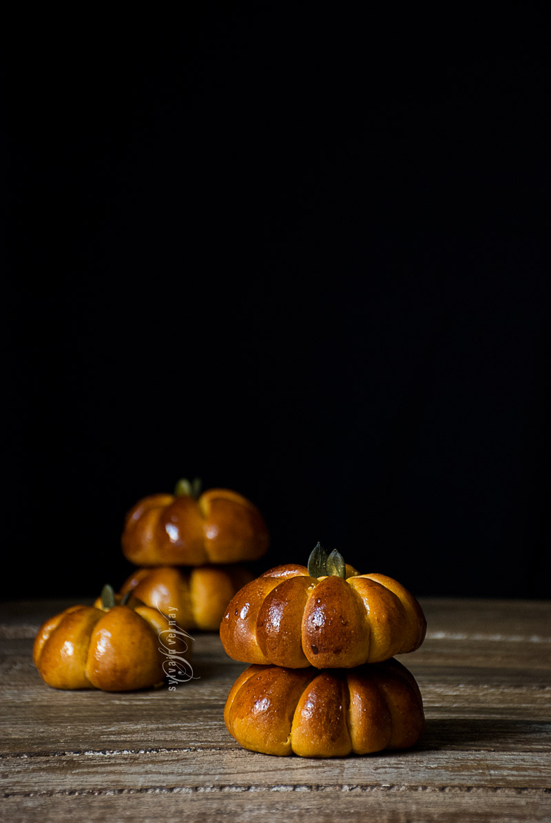 - Para dar la ilusión de una calabaza (como en la foto principal), podéis colocar un panecillo boca abajo y poner encima otro panecillo. Para las hojas, he usado semillas de calabaza tostadas (que, además, están riquísimas).
